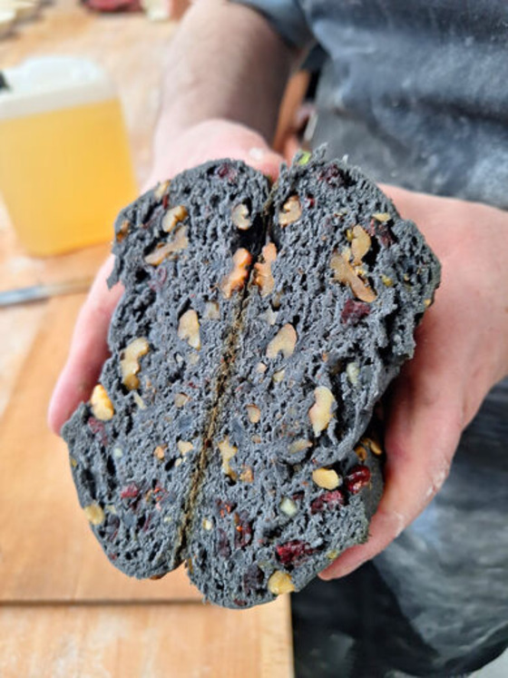 Inhaltsstoffe: Stollenmehl, Zucker, Butter, Sukkant, Orangeat, Walnüsse, Salz, Cranberrys, Macisblüte, Muskatnuss, Aktivkohlepulver, Wasser, Hefe